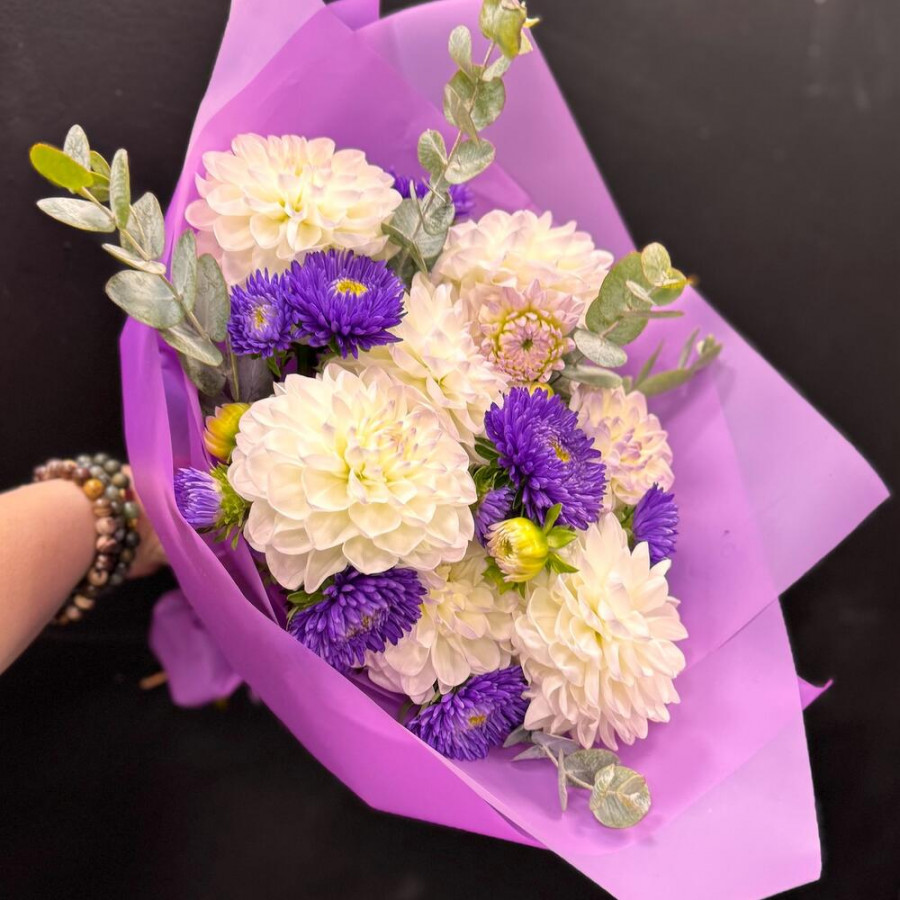 На фото букет из георгинов и астр. В составе: георгина 7 шт, астра 6 шт, эвкалипт 4 шт, дизайнерская упаковка 1 шт, атласная лента 1 шт, . Все цветы свежие и ароматные, букет красиво оформлен и отлично подходит для подарка. Доступна доставка цветов или самовывоз.